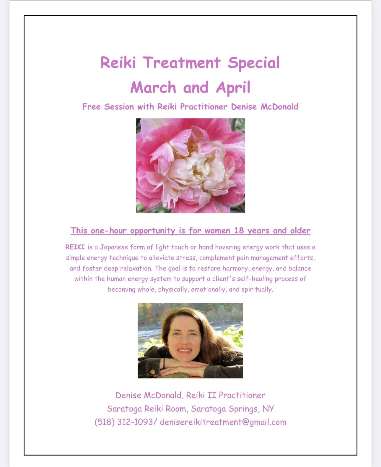 Denise McDonald is offering FREE one hour Reiki Treatments in March and April!